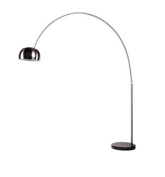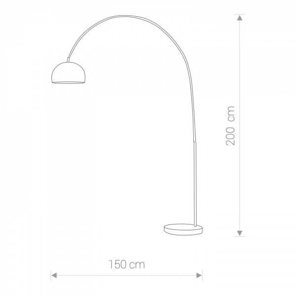 Nowoczesna lampa stojąca, wykonana ze stali, z długim ramieniem wygiętym w pałąk. Idealna do salonów urządzonych w modernistycznym stylu, pasuje również do wnętrz urządzonych w stylu boho loft lub retro.