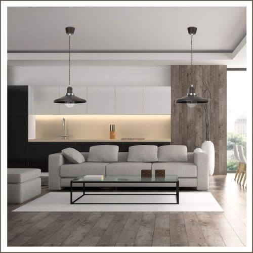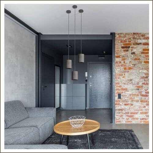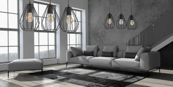 Pierwsze wrażenie budują lampy wiszące. Mimo, iż nie ma jednych konkretnych wytycznych w kwestii koloru, najczęściej oprawy są stonowane. Czarne lub białe. Monochromatyczność dodatkowo podkreśla minimalistyczny aspekt tego stylu. Jeśli szukamy koloru to postawmy na szarości, chrom, miedź lub złoto, nawiązujące kolorystycznie do odsłoniętej na ścianie cegły lub miedzianych rur. Możemy również podkreślić loftowe szarości stawiając na zyskujące coraz większą popularność, oprawy z gipsu lub betonu.